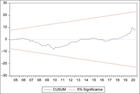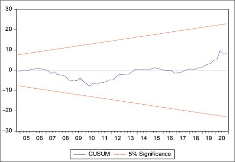 Note: The CUSUM statistic remains within the 5% significance band, confirming stability of the estimated coefficients.