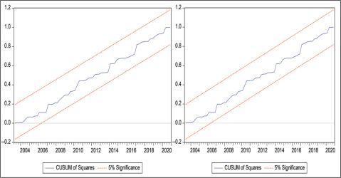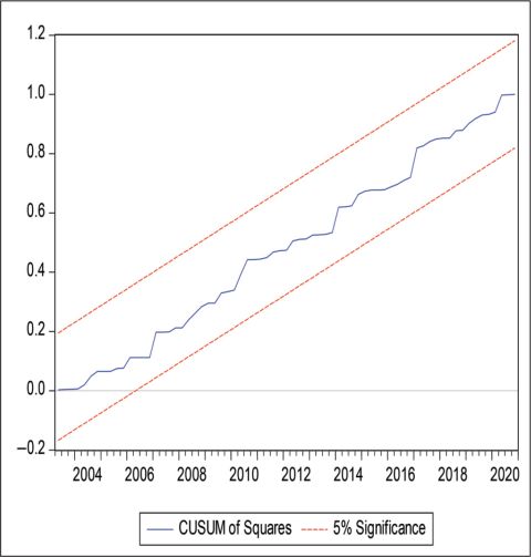 Note: The CUSUMQ statistic lies within the 5% significance bands throughout the sample period, suggesting parameter constancy and absence of structural breaks.
