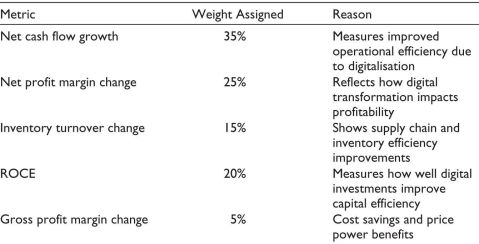For the purpose of this research, the explanatory variable is the Digital Transformation Index. This index includes references to digital transformation in corporate filings, the contribution of e-commerce and direct-to-consumer channels to revenue, disclosed investments in IT, digital transformation and initiatives aimed at digitising the supply chains, such as inventory optimisation and AI-driven demand forecasting. Dependent variables are gross margin (%) (Data from ProwessIQ and MoneyControl), net profit margin (%) (Data from ProwessIQ and MoneyControl), inventory turnover ratio (Data from ProwessIQ and MoneyControl) and capital employed using return on equity (ROCE) (Data from ProwessIQ and MoneyControl). This research employs a combination of descriptive (trends of digital transformation for investments and profitability metrics over time), longitudinal (5-year relationship between digital transformation indicators and profitability metrics), comparative case-based analysis and digital adoption in terms of low versus high for the five companies. Table 1 lists the weights for each metric used in calculating the Digital Transformation Index, along with the reasons for selecting them. So, the Digital Transformation Index comprises the five metrics of Net Cash Flow Growth, Net Profit Margin Change, Inventory Turnover Change, ROCE and Gross Profit Margin Change for the purpose of calculating the composite score by summing up all these components/metrics. The time period for this analysis is 2019–2020 to 2023–2024 (5-year period).